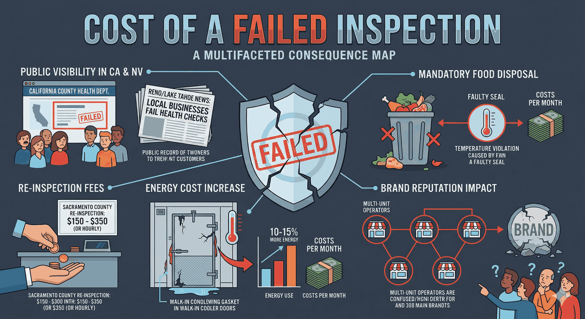 - A failed health inspection in California is public record and appears on county health department websites — visible to customers